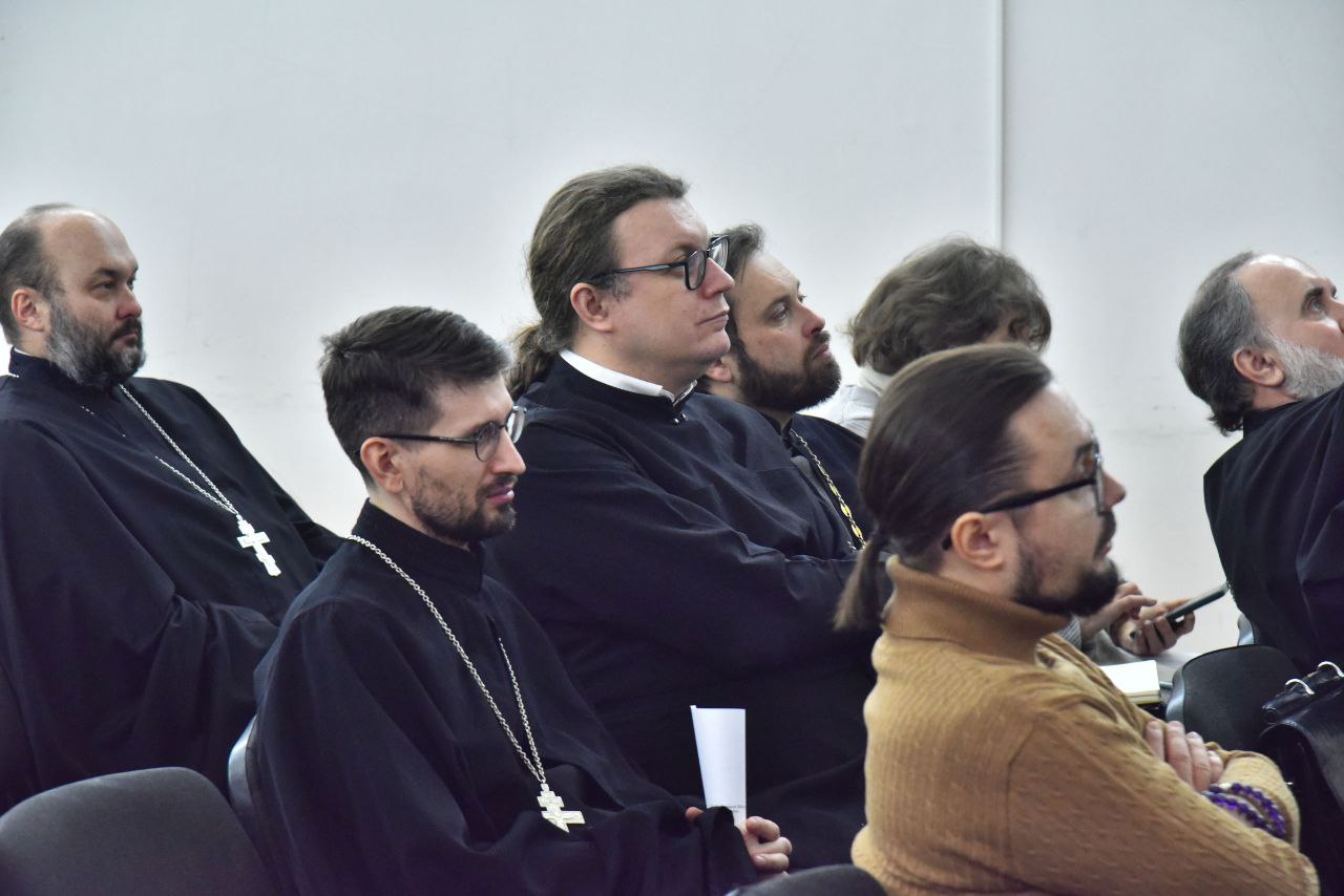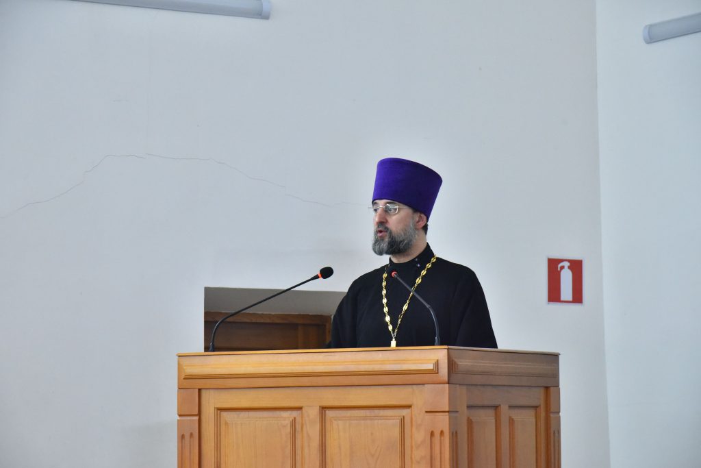 Приветственное слово председателя Учебного комитета Русской Православной Церкви протоиерея Максима Козлова зачитал сотрудник Учебного комитета, магистр богословия, и.о. настоятеля храма преподобного Серафима Саровского на Краснопресненской набережной г. Москвы иерей Димитрий Каширин.